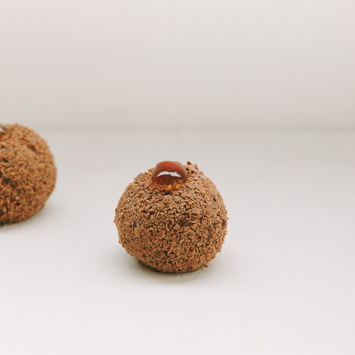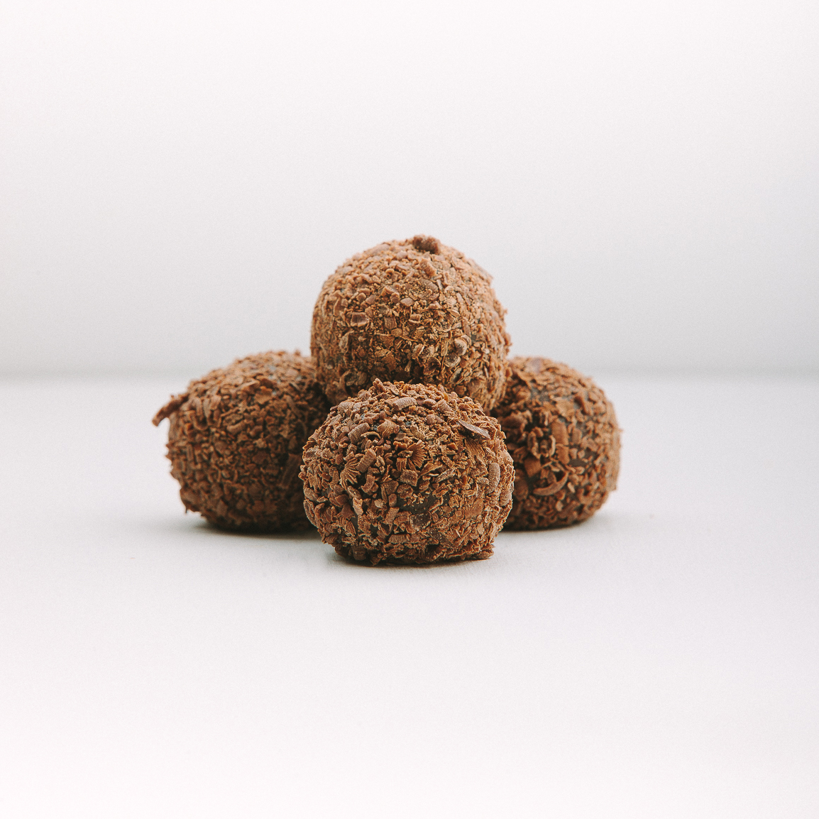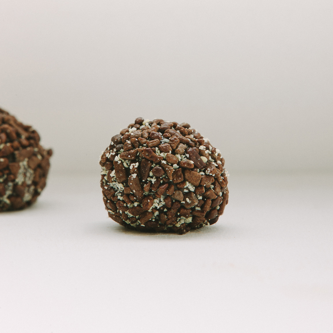 Brigadeiro feito com 100% cacau envolto em lascas de chocolate amargo.
