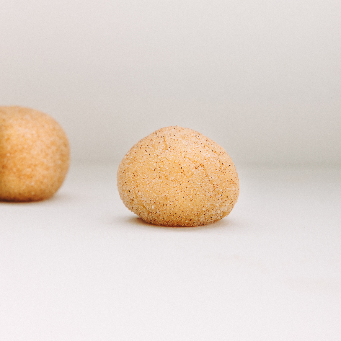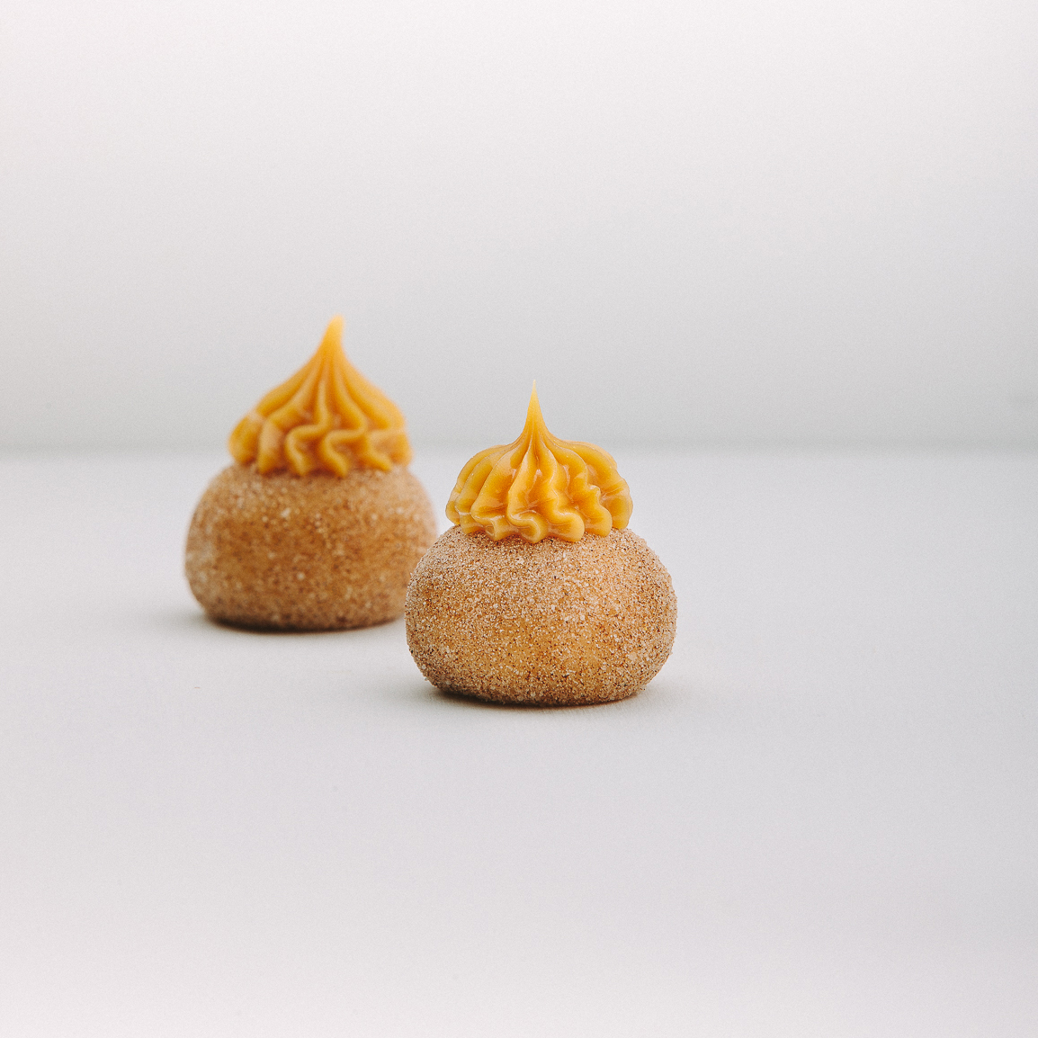 Brigadeiro especial branco envolto em açúcar e canela com pitanga de doce de leite cremoso.