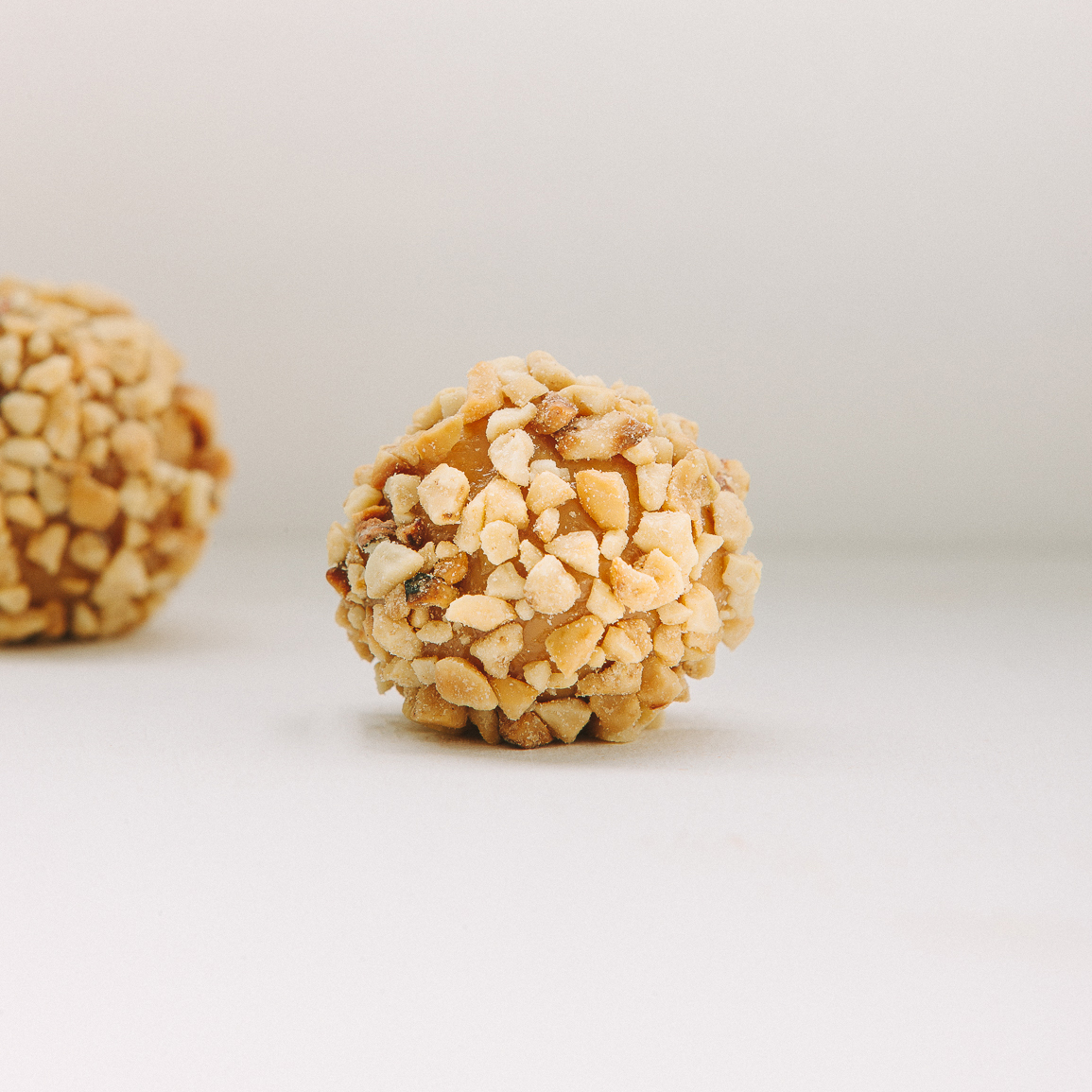Brigadeiro de leite condensado com doce de leite cremoso misturado na massa. Envolto em castanha de cajú.