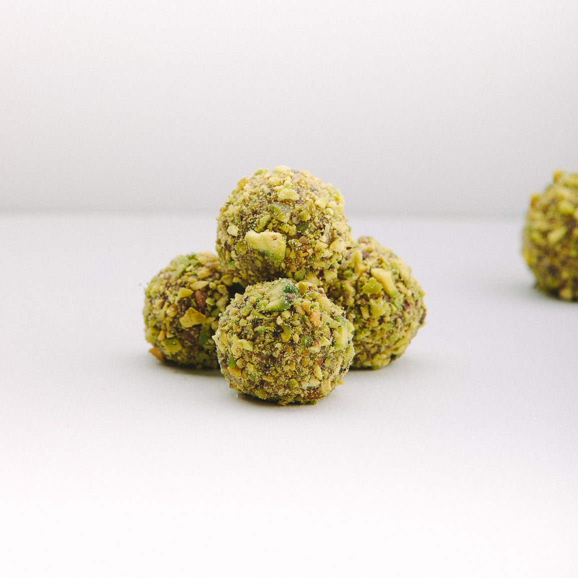 Brigadeiro de leite condensado com muito pistache na massa envolto em pistache triturado.