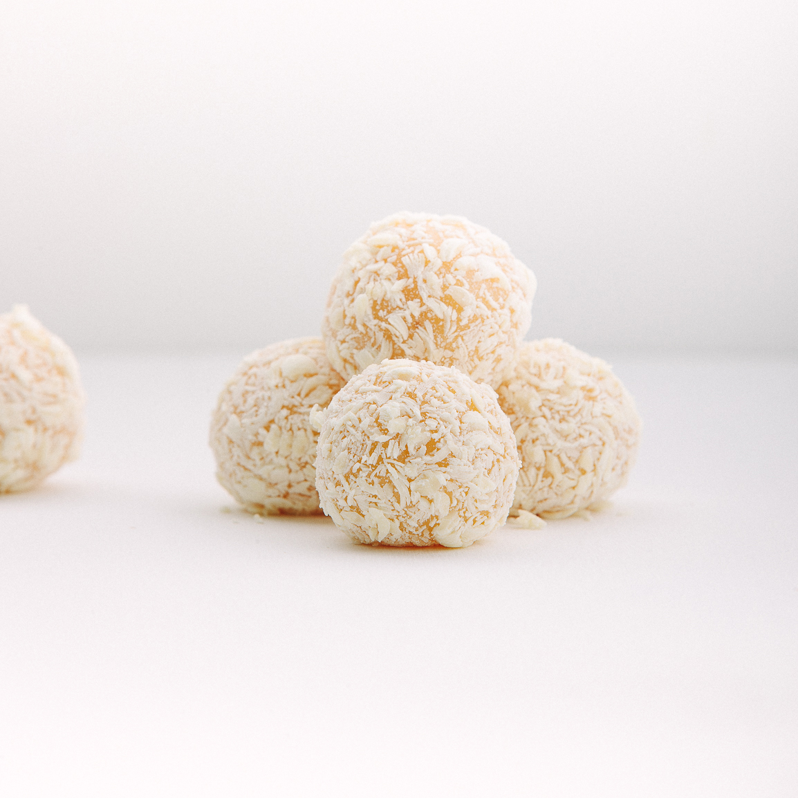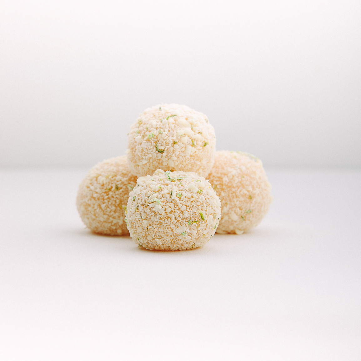 Brigadeiro de leite condensado com raspas de limão tahiti envolto em raspas de chocolate branco e limão.